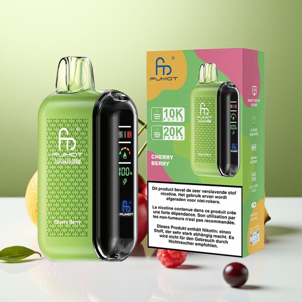 Fumot Tornado 20000 نفخة تبخير قابل لإعادة الشحن بنكهة الكرز والتوت مع شاشة ذكية ومراقبة تدفق الهواء
