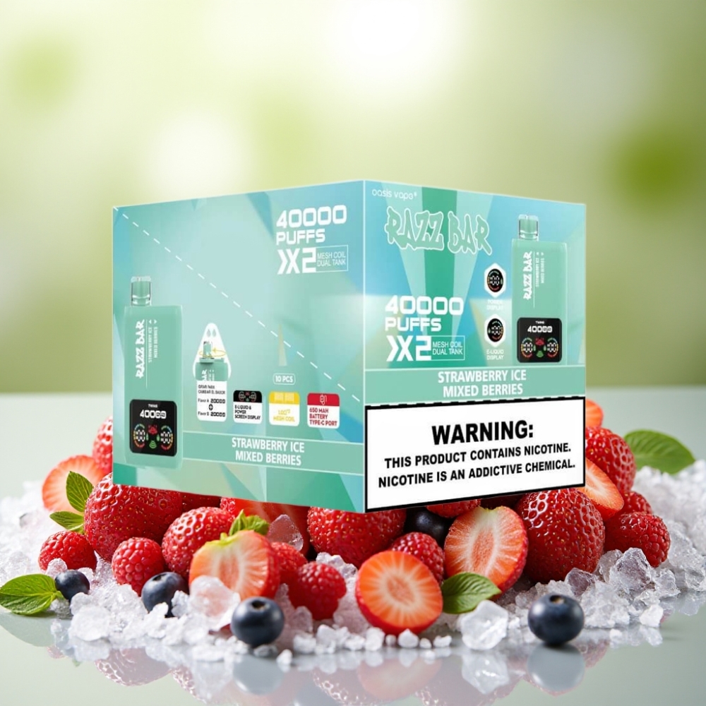 Razz Bar 40000 نفخة فيب صالح للاستعمال مرة واحدة فراولة مثلجة وتوت مشكل مع شاشة عرض وملف شبكي 1.0Ω×2