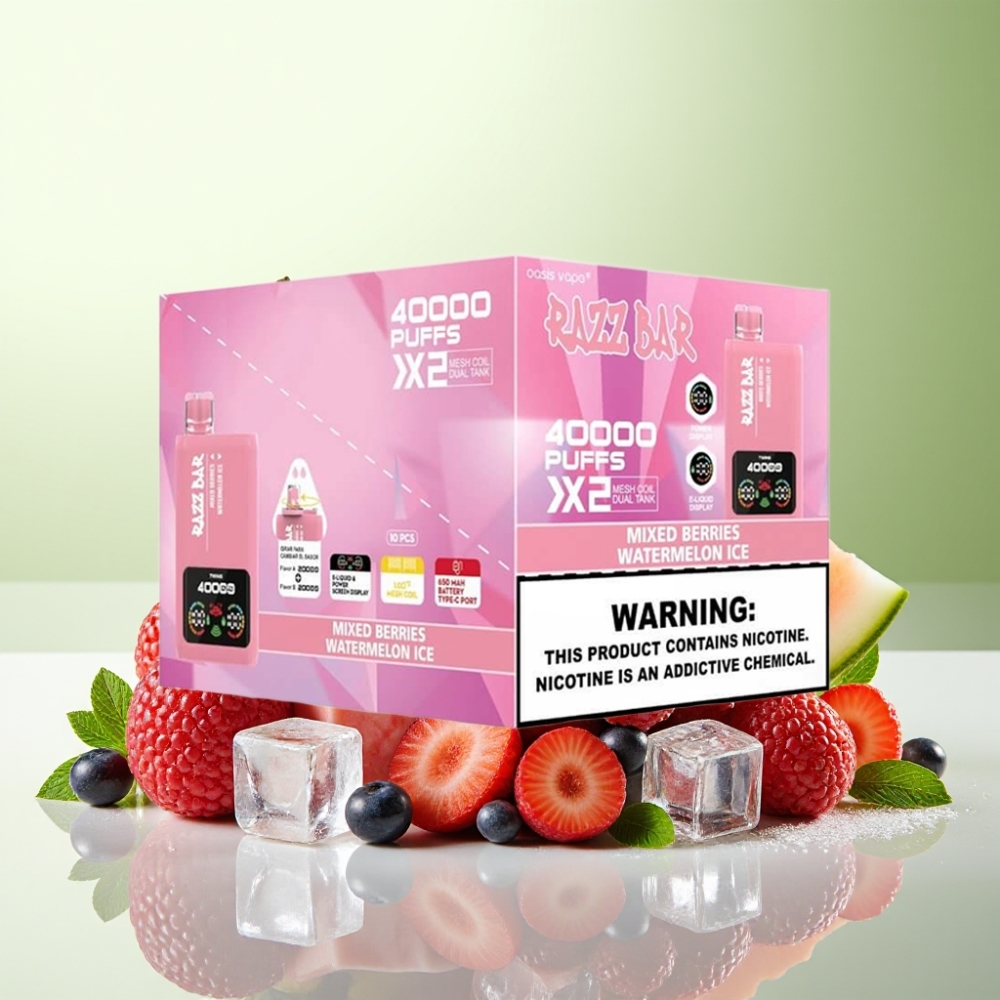 Razz Bar 40000 نفخة فيب قابل للتخلص بنكهة التوت المختلط والبطيخ المثلج مع شاشة عرض وملف شبكي مزدوج 1.0Ω